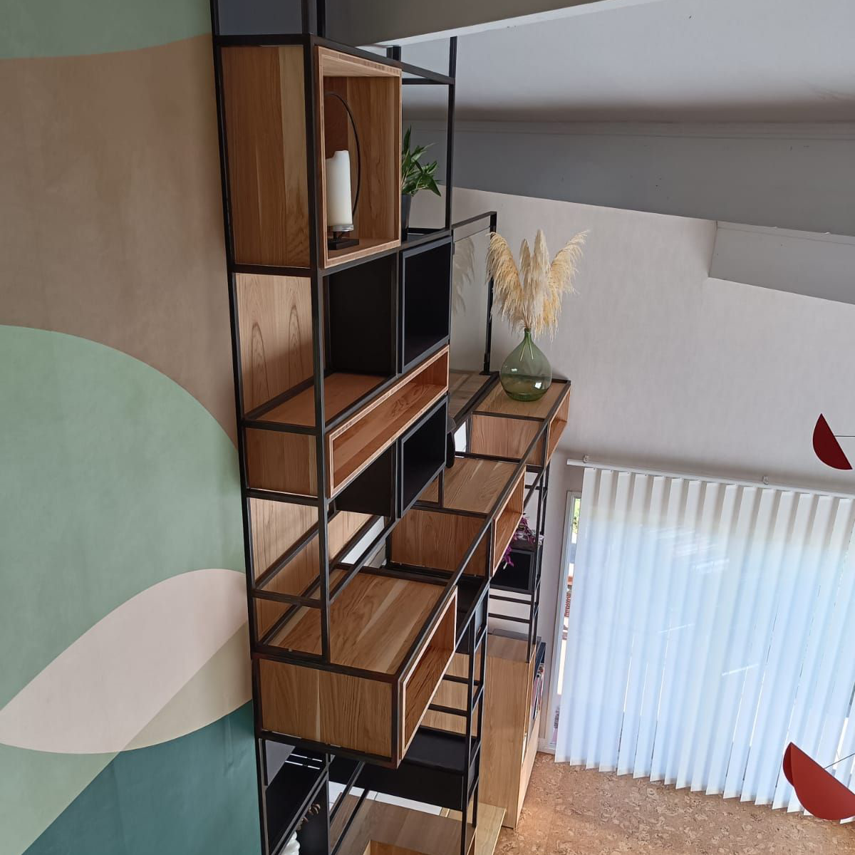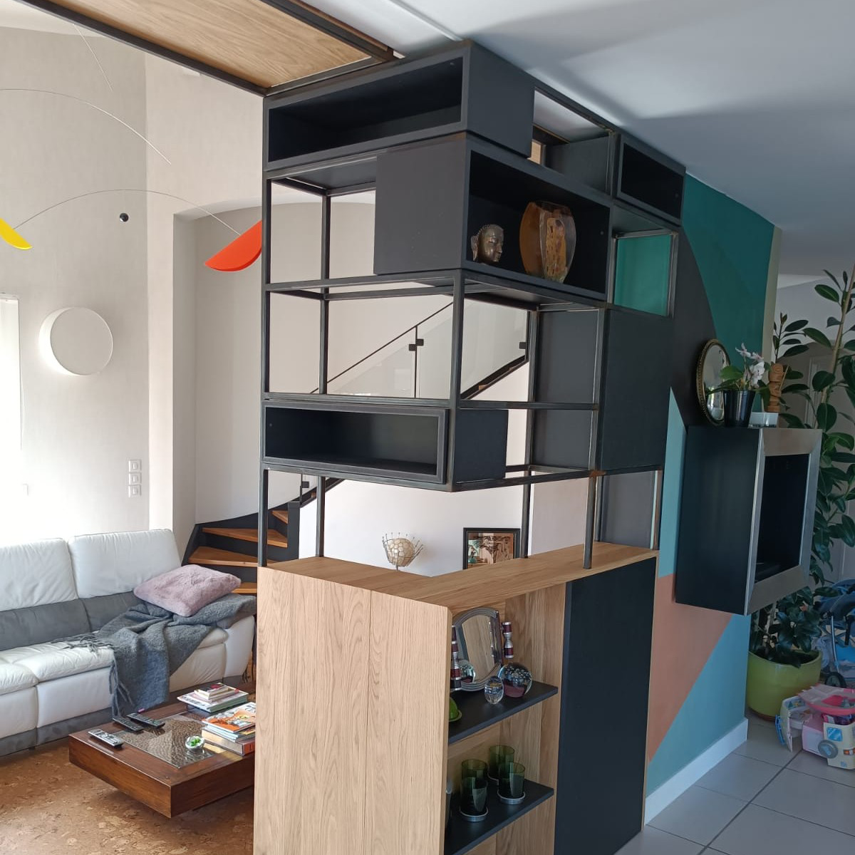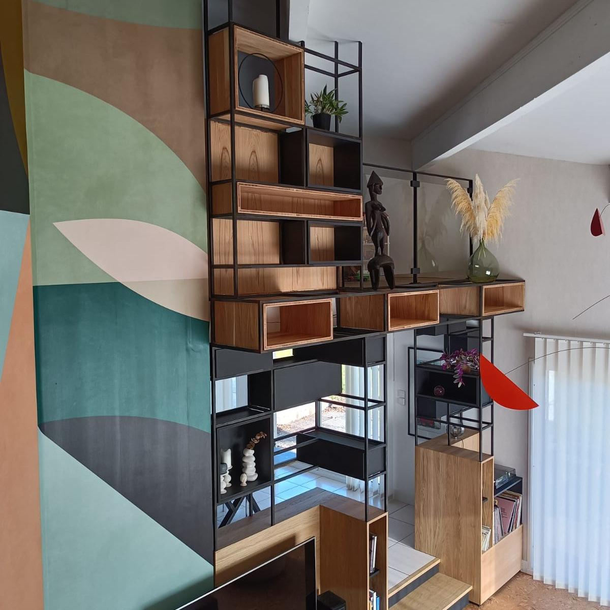 Pour mettre en avant une belle hauteur sur plafond : combiner modules de rangement, niches décoratives et une base pour le coin salon. Ce meuble crée un lien entre le salon, la salle à manger et la mezzanine en guise de garde-corps.